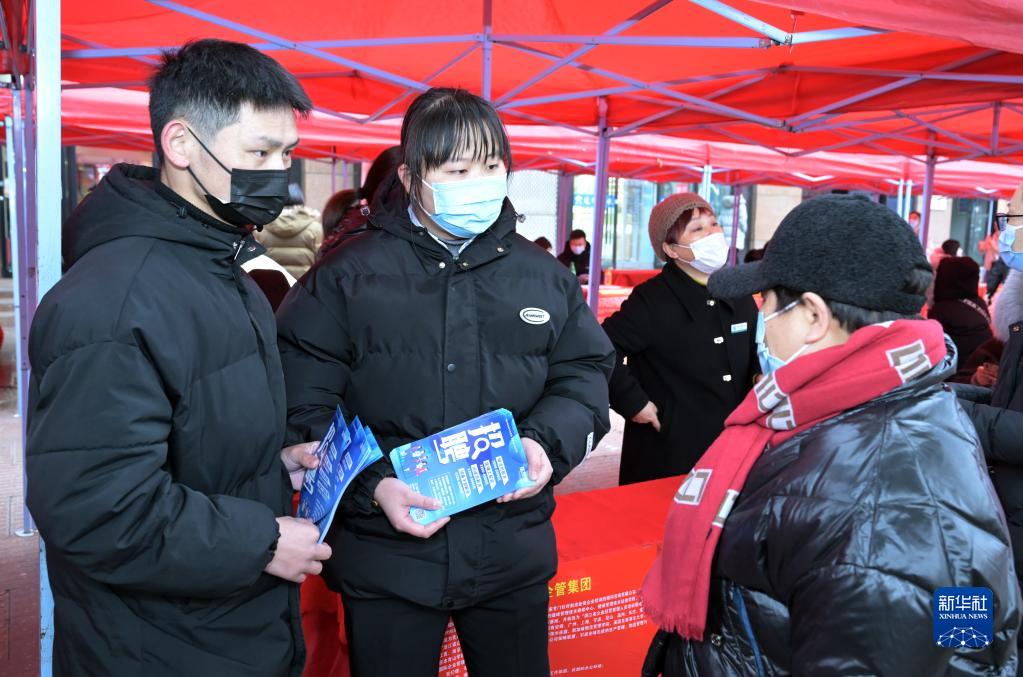 2月10日,在合肥市蜀山區環(huán)球金融廣場(chǎng)舉行的招聘會(huì )上,招聘人員與求職者(右)交流崗位信息。