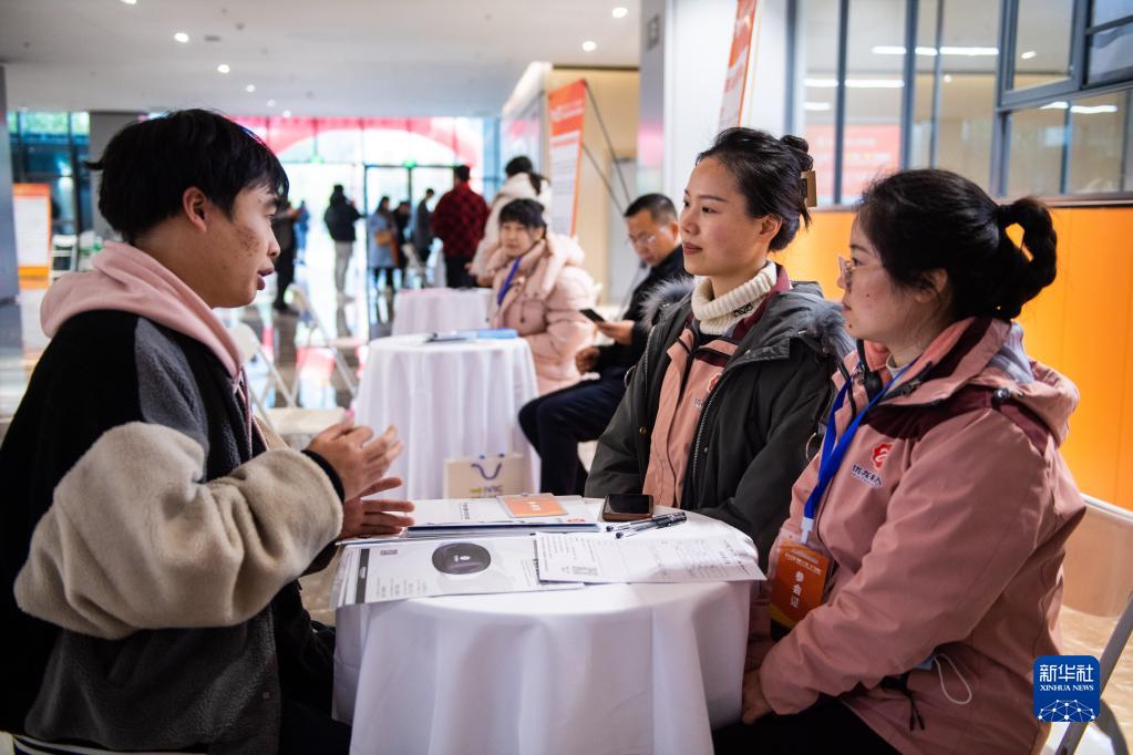 2月10日,在長(cháng)沙麓谷科技創(chuàng )新創(chuàng )業(yè)園,求職者與招聘人員溝通。