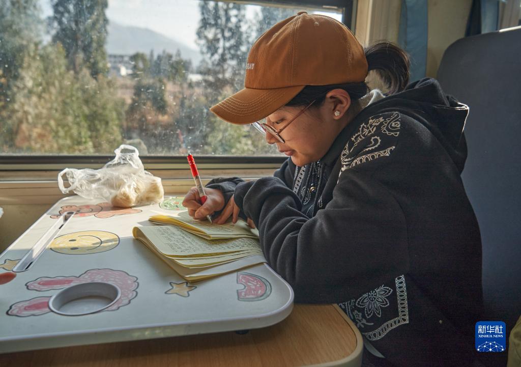 2月9日,學(xué)生在5633次列車(chē)上寫(xiě)作業(yè)。