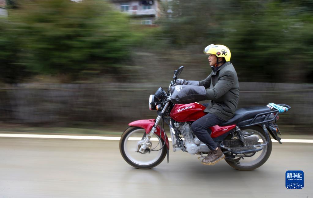 江西宜春袁州區楠木鄉官溪小學(xué)教師賴(lài)小田在騎摩托車(chē)上班途中(2月9日攝)。