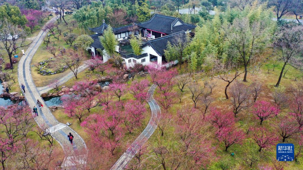 2月10日,游客在江蘇揚州瘦西湖風(fēng)景區賞梅(無(wú)人機照片)。