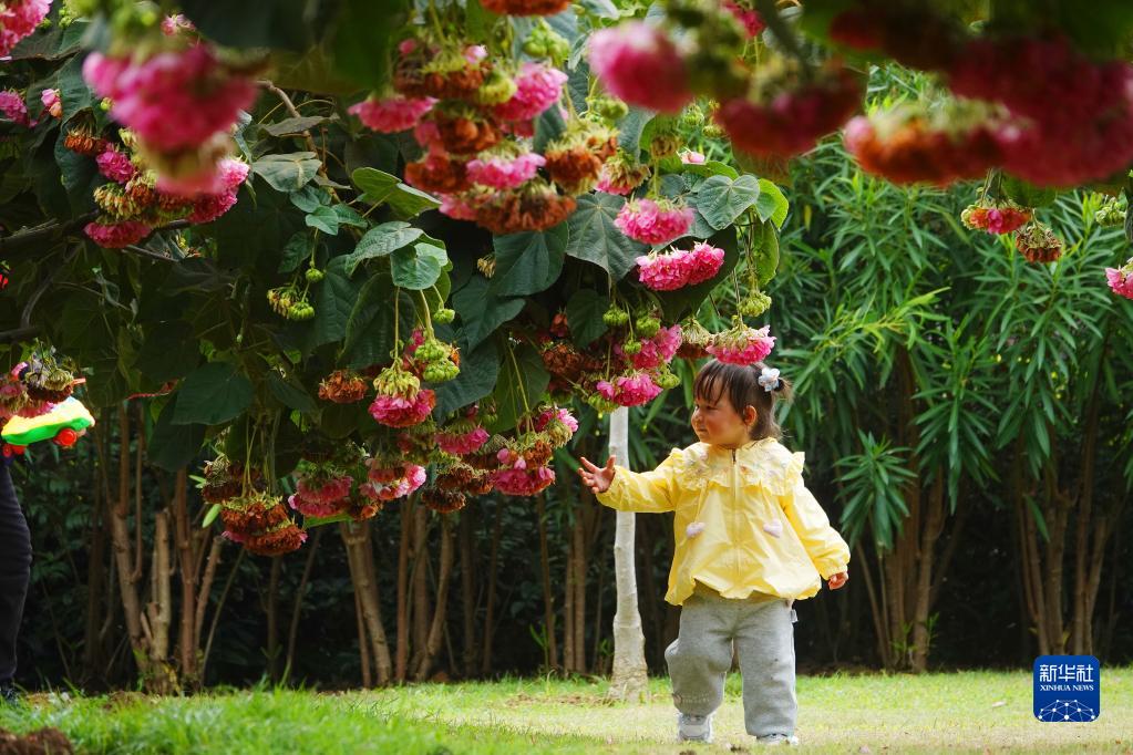 2月11日,一名小女孩在廣西南寧市南湖公園觀(guān)賞綻放的非洲芙蓉花。
