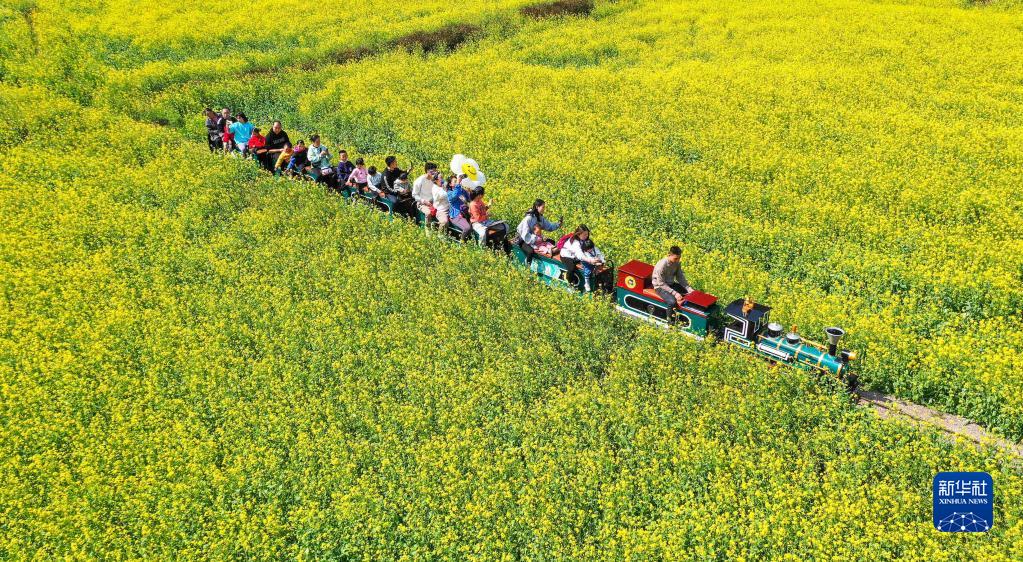 2月11日,在貴州省黔西南布依族苗族自治州興義市,游客乘坐小火車(chē)觀(guān)賞油菜花(無(wú)人機照片)。