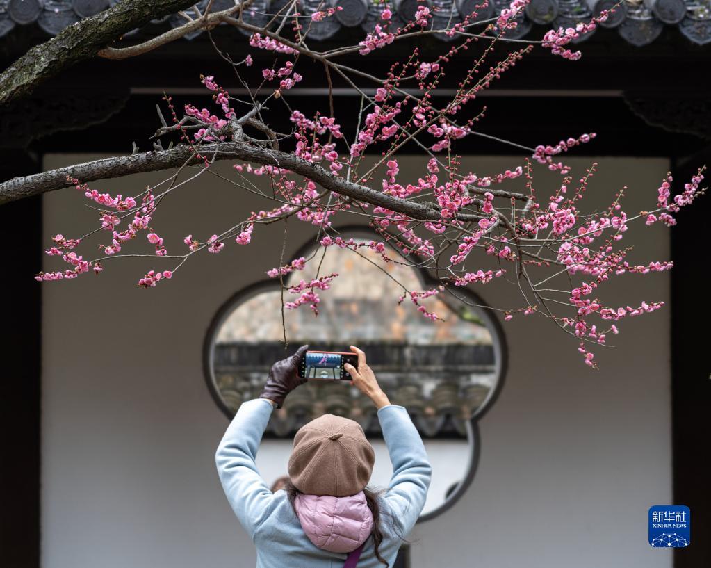 2月10日,游人在南京市雨花臺風(fēng)景區拍攝梅花。