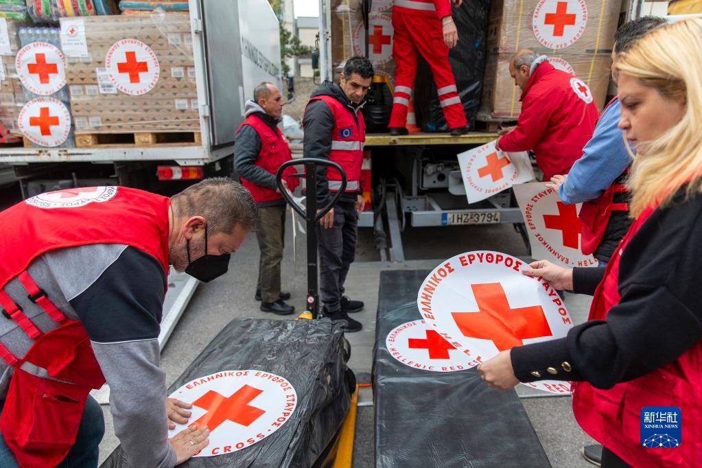 2月10日,紅十字會(huì )工作人員在希臘雅典準備將救援物資裝車(chē)。