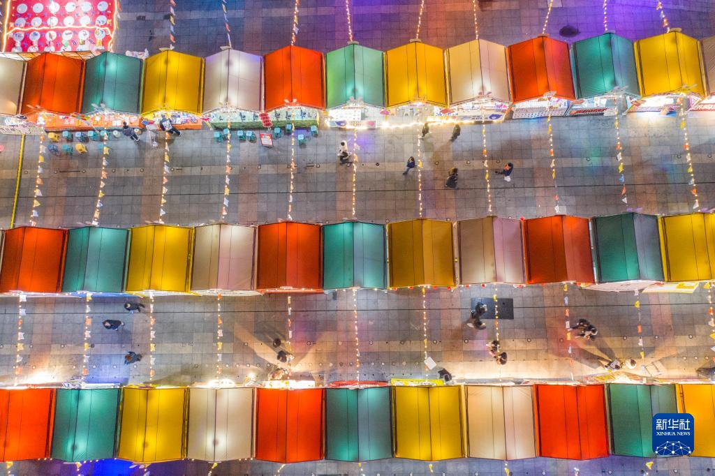2月9日晚,游客在位于重慶市南岸區南濱路旁的彩虹集市休閑游覽(無(wú)人機照片)。