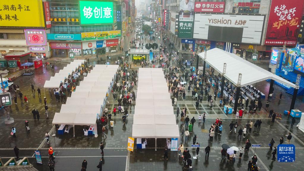 這是位于長(cháng)沙市天心區黃興南路步行街的招聘活動(dòng)現場(chǎng)(2月11日攝,無(wú)人機照片)。