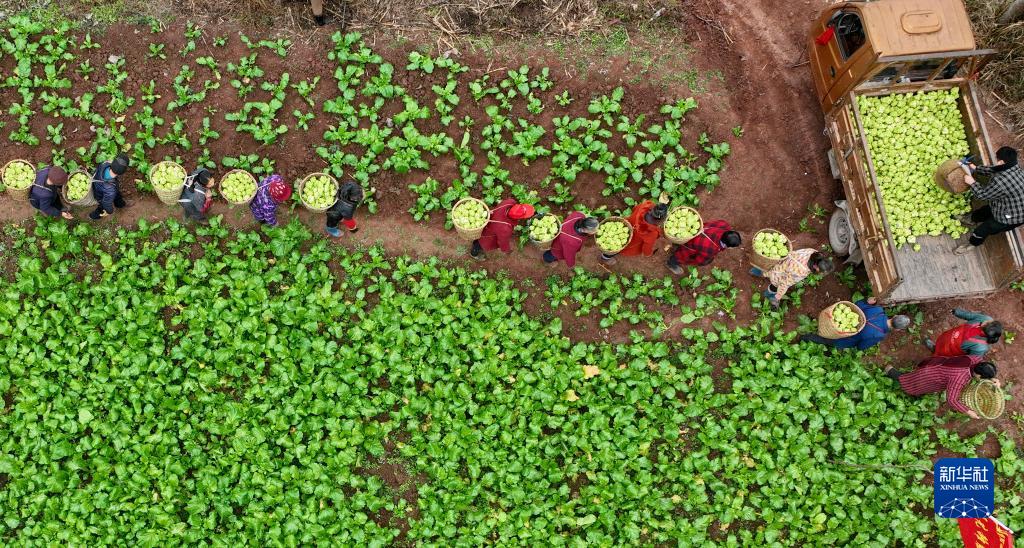 2月10日,南充市嘉陵區安福鎮埡子口村的村民將收獲的青菜頭裝車(chē)(無(wú)人機照片)。