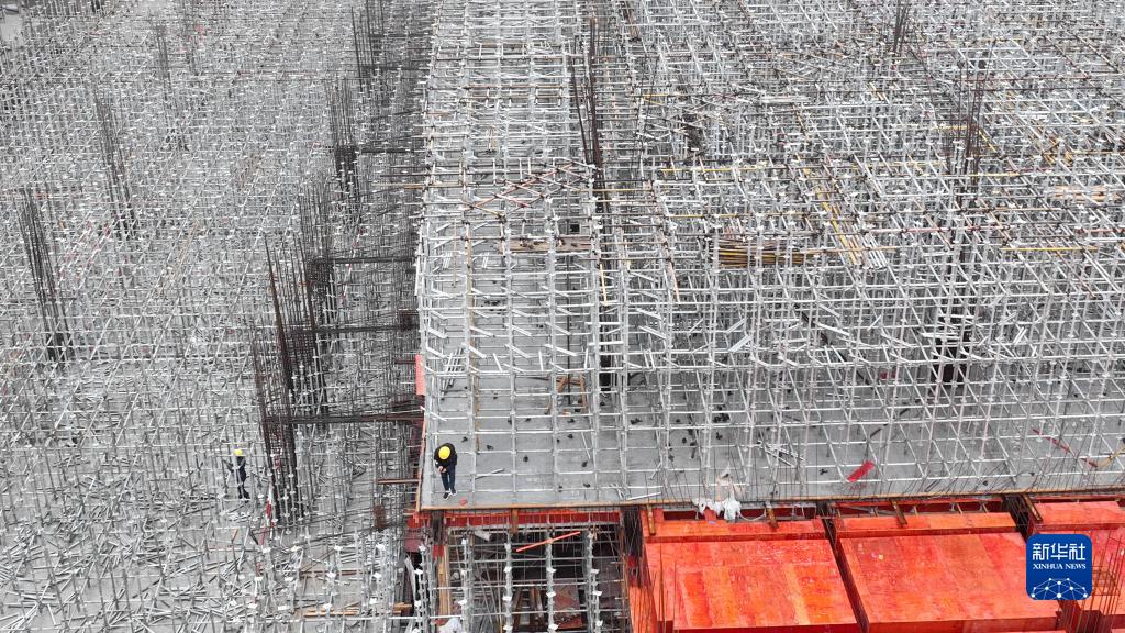 2月11日,工人在浙江省湖州市德清縣康乾街道莫干山智能生態(tài)城創(chuàng )新創(chuàng )業(yè)產(chǎn)業(yè)園項目工地施工(無(wú)人機照片)。