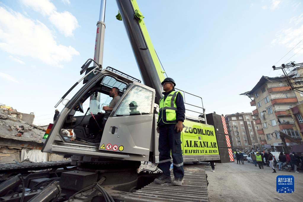 2月10日,中聯(lián)重科救援隊隊員余可(右)在土耳其哈塔伊省安塔基亞市參與搜救。
