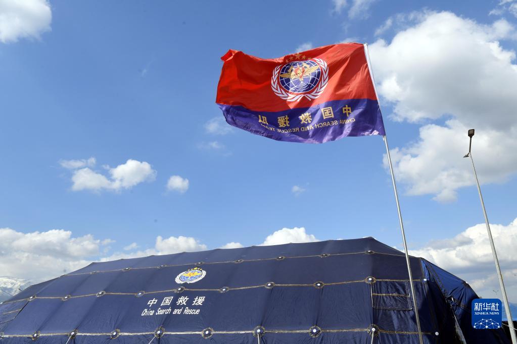 這是2月10日在土耳其哈塔伊省安塔基亞市拍攝的中國救援隊駐扎營(yíng)區。