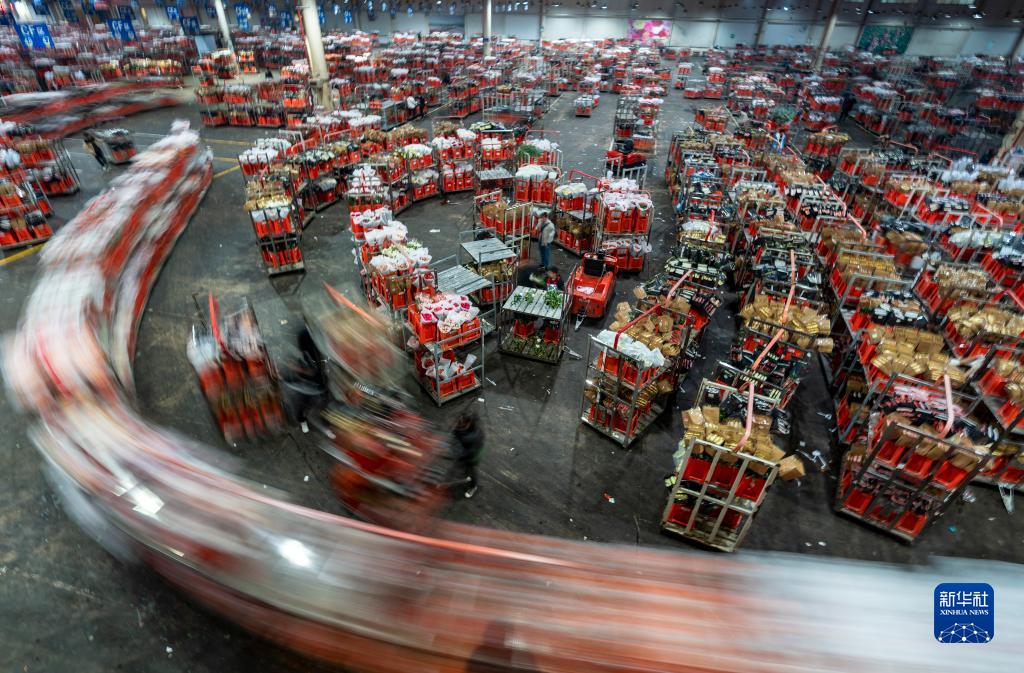 這是在昆明國際花卉拍賣(mài)交易中心拍攝的運輸鮮花的臺車(chē)(1月31日攝)。