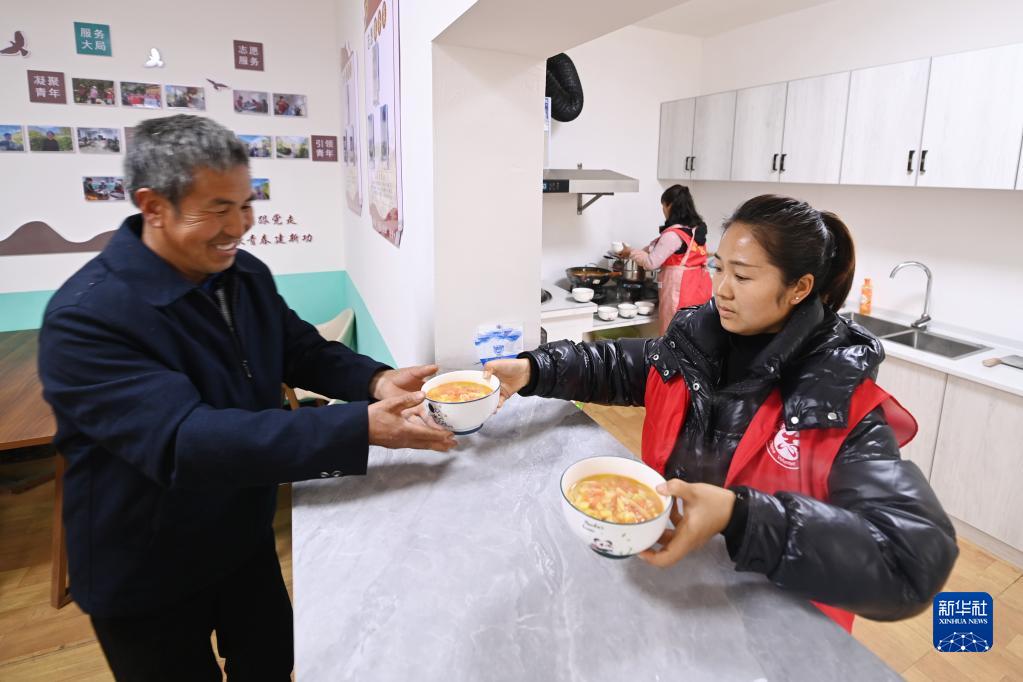 在隴南市宕昌縣官亭鎮王家村“幸福家園”,村民在食堂打飯(2月8日攝)。