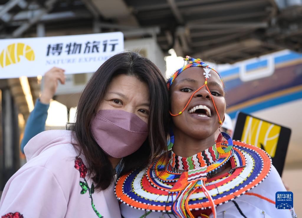2月11日,在肯尼亞首都內羅畢喬莫·肯雅塔國際機場(chǎng),中國游客和肯尼亞演員合影。