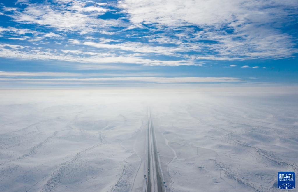 阿勒泰至烏魯木齊的高速公路,穿越古爾班通古特沙漠(2023年1月16日攝,無(wú)人機照片)。