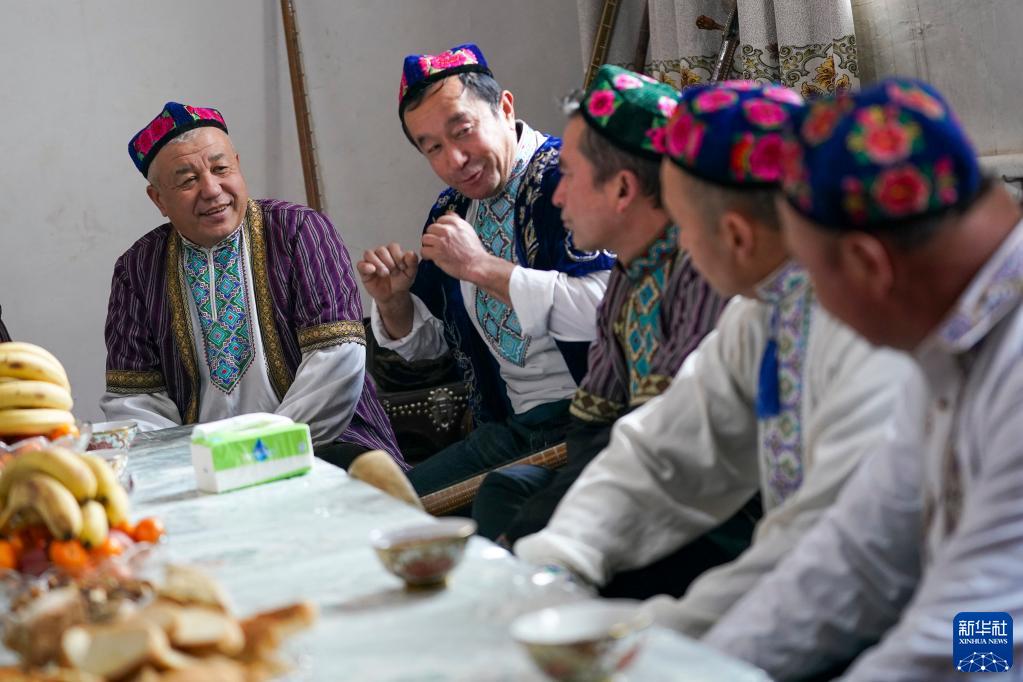 在新疆鄯善縣魯克沁鎮木卡姆村,吐魯番木卡姆傳承人蘇來(lái)曼·阿不都(左一)和鄉村藝人聊天(2023年1月11日攝)。節慶或者聚會(huì )邀請木卡姆藝人一起演奏歌唱,是當地的傳統保留節目。新華社記者 趙戈 攝