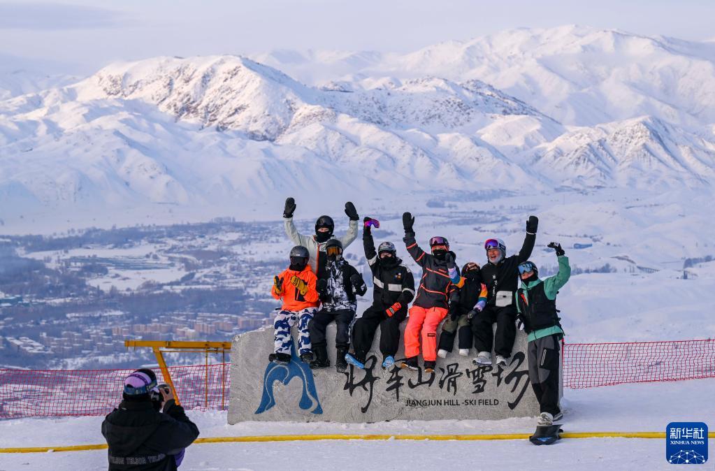 游客在新疆阿勒泰將軍山滑雪場(chǎng)合影留念(2022年12月30日攝)。新華社記者 胡虎虎 攝