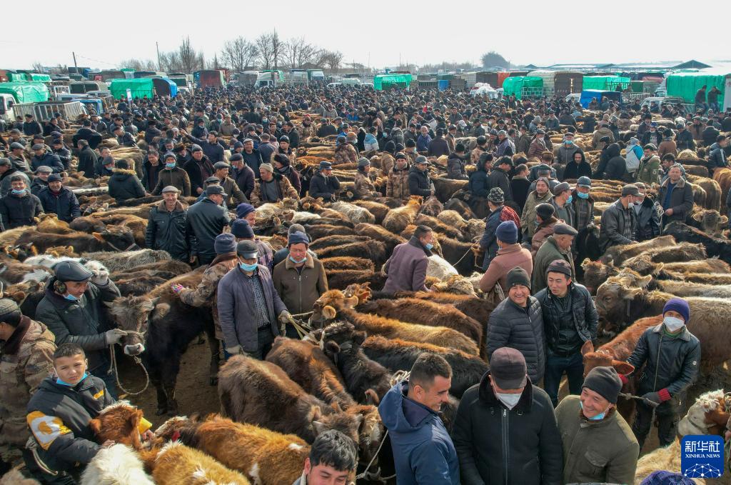 人們在新疆創(chuàng )錦黃公農產(chǎn)品交易市場(chǎng)交易(2023年2月1日攝,無(wú)人機照片)。當日,位于新疆伊寧縣愉群翁回族鄉阿勒推村的創(chuàng )錦黃公農產(chǎn)品交易市場(chǎng)開(kāi)市,市場(chǎng)商品琳瑯滿(mǎn)目,牛羊馬交易火爆。新華社發(fā)(劉春星 攝)