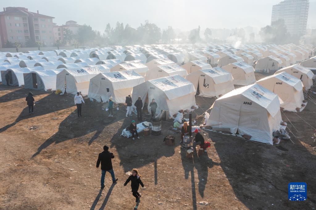 2月11日,在土耳其哈塔伊省安塔基亞市,受地震影響的人們在帳篷外休息(無(wú)人機拍攝)。
