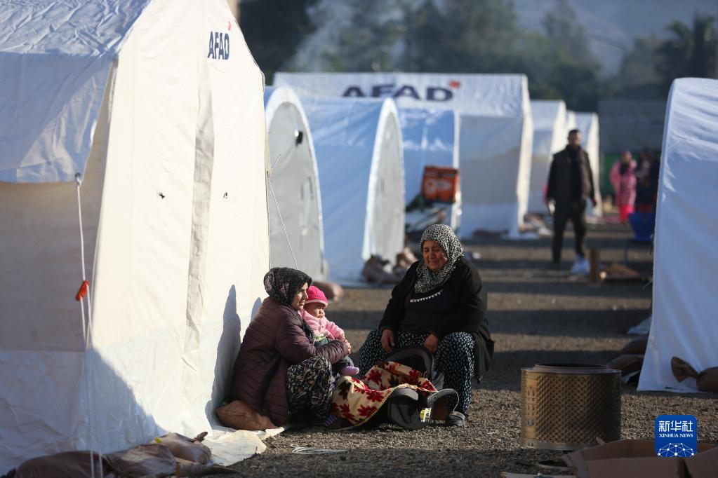 2月11日,在土耳其哈塔伊省安塔基亞市,受地震影響的人們在帳篷外休息。