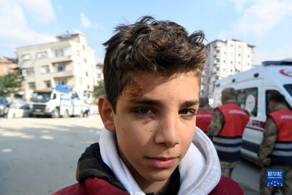 2月11日,在地震中受傷的12歲男孩薩比提走在土耳其哈塔伊省安塔基亞市街頭。