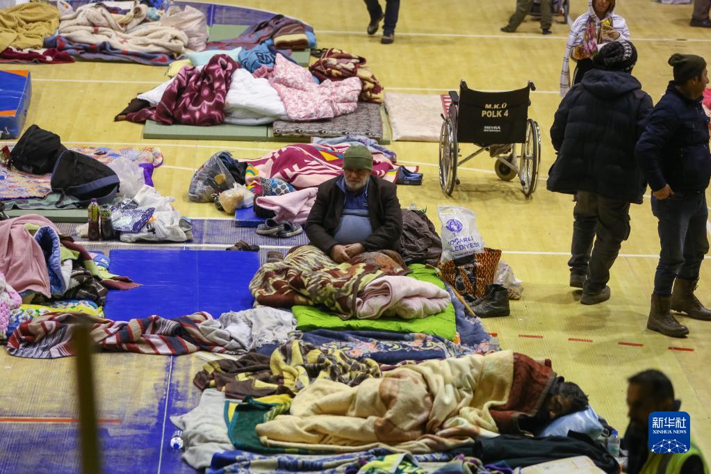 2月11日,受地震影響的人們在土耳其哈塔伊省安塔基亞市的一個(gè)體育館休息。