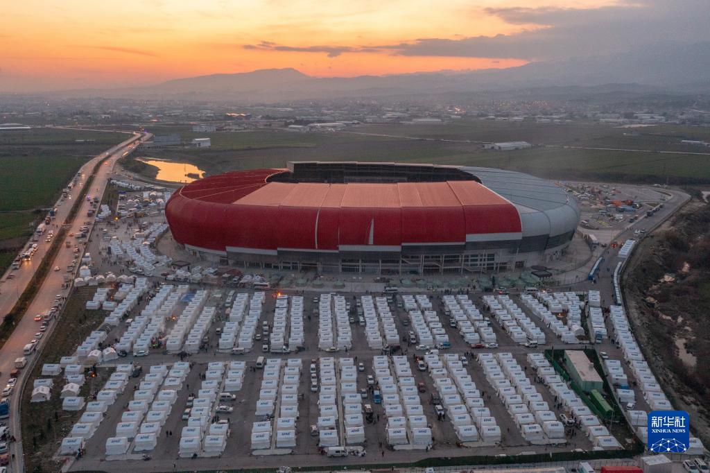 這是2月11日在土耳其哈塔伊省安塔基亞市用無(wú)人機航拍的臨時(shí)搭建的帳篷。