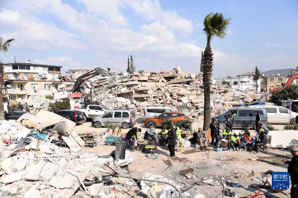 2月11日,救援人員聚集在土耳其哈塔伊省安塔基亞市的一處地震廢墟附近。