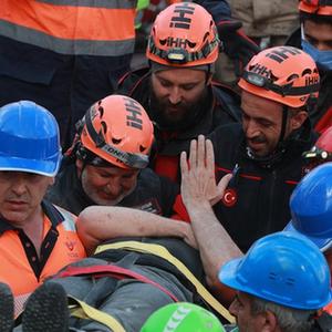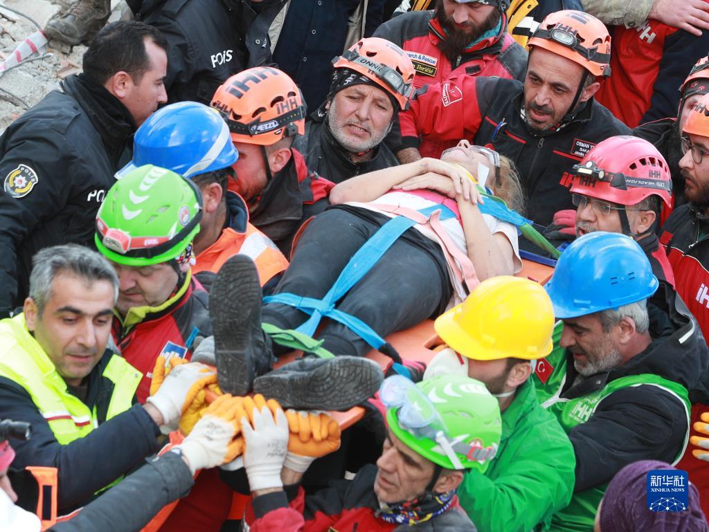 2月10日,救援人員在土耳其哈塔伊省安塔基亞市轉移幸存者。