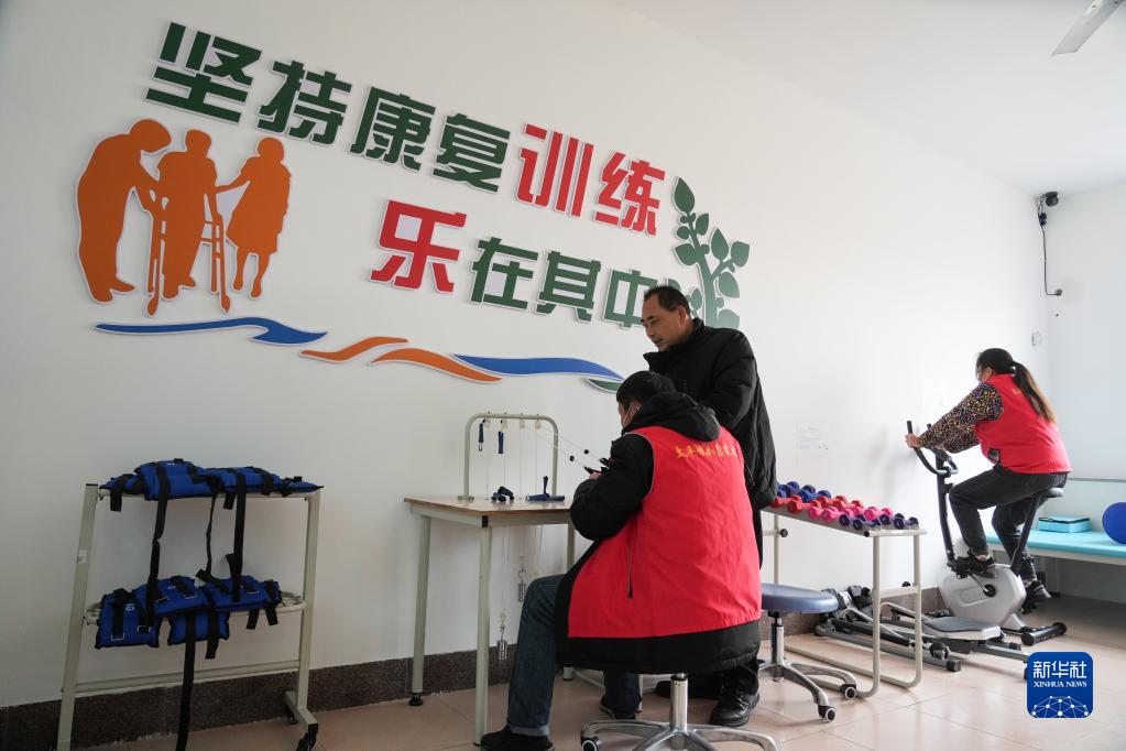 2月12日,在山東鄒城市太平鎮如康家園內,殘疾人在工作人員的指導下進(jìn)行康復訓練。