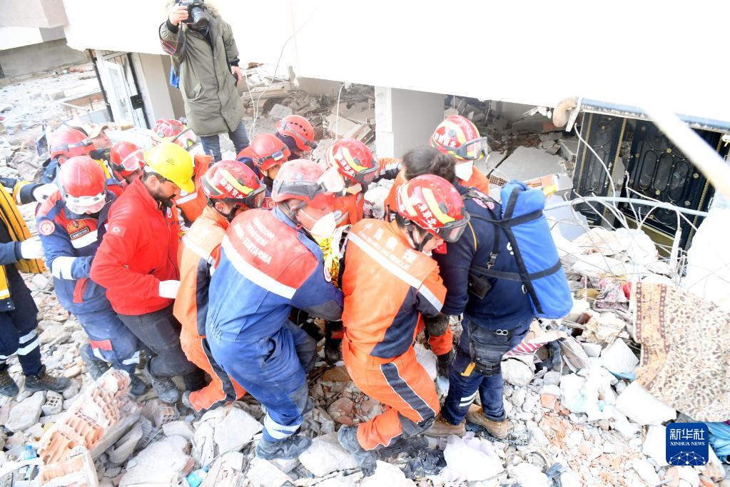 當地時(shí)間12日下午,正在土耳其哈塔伊省安塔基亞市實(shí)施搜救的中國救援隊營(yíng)救出一名幸存者。