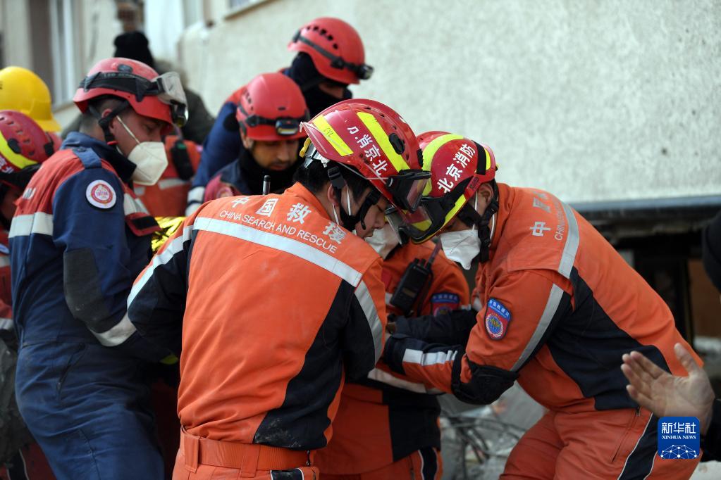 2月12日,在土耳其哈塔伊省安塔基亞市,中國救援隊轉移一名救出的幸存者。