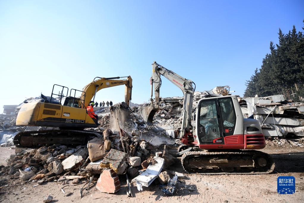 2月12日,大型機械在土耳其哈塔伊省安塔基亞市一處地震廢墟中作業(yè)。