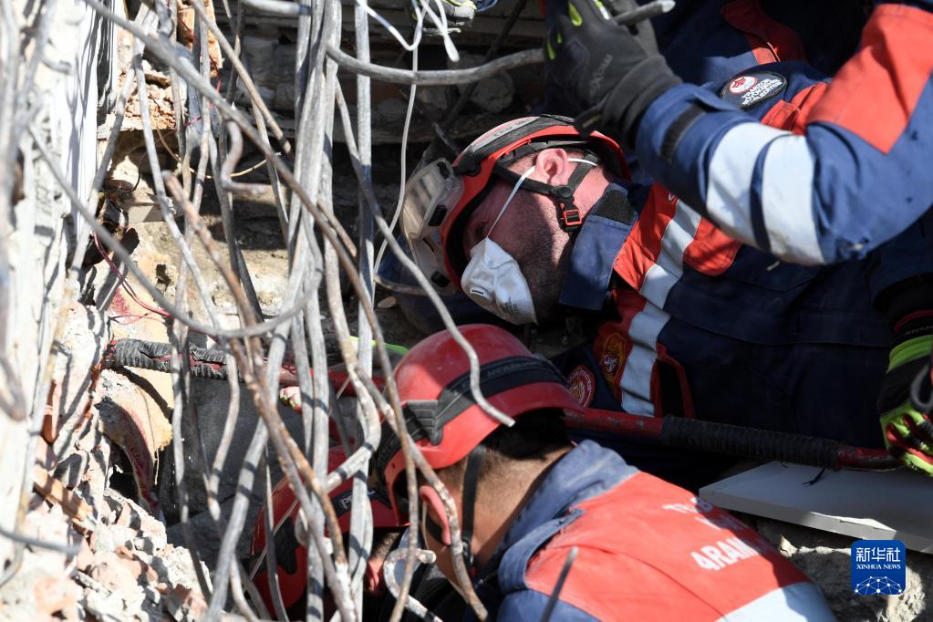 2月12日,救援人員在土耳其哈塔伊省安塔基亞市一處地震廢墟開(kāi)展救援工作。