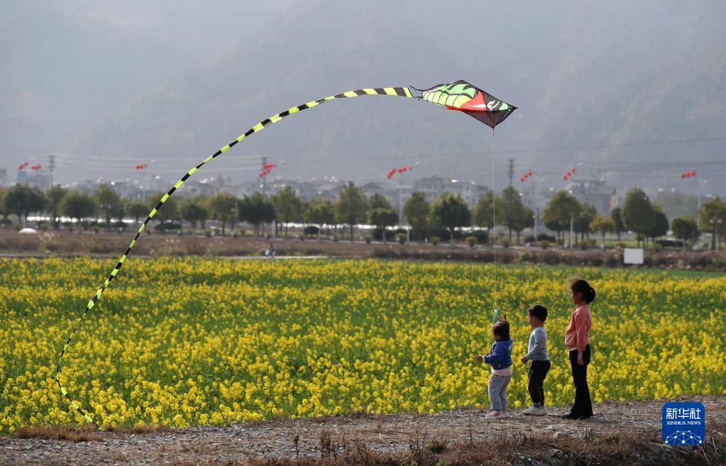 2月12日,小朋友在貴州省黔東南苗族侗族自治州榕江縣古州鎮車(chē)江壩區油菜花田邊放風(fēng)箏。
