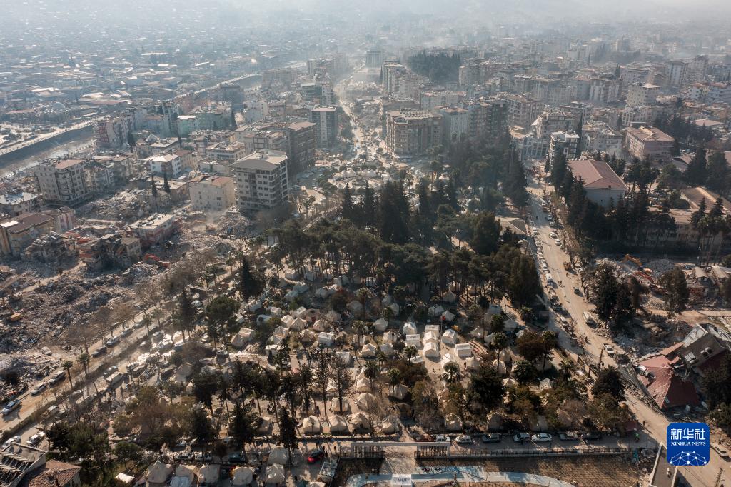 這是2月12日在土耳其哈塔伊省安塔基亞市中心拍攝的地震廢墟和救援帳篷(無(wú)人機照片)。