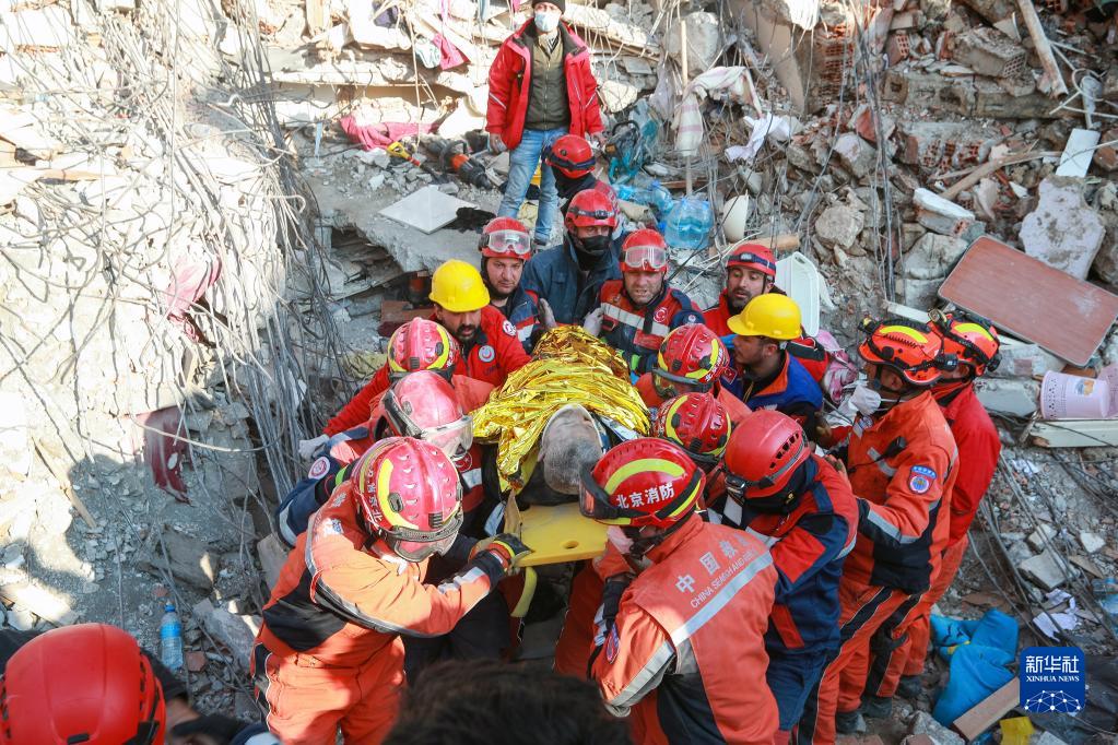 2月12日,在土耳其哈塔伊省安塔基亞市,中土兩國救援隊隊員轉移一名救出的幸存者。