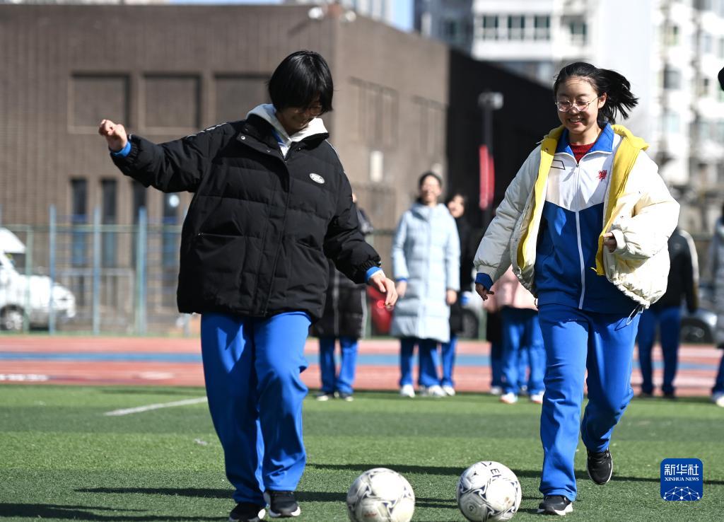 2月13日,天津市耀華中學(xué)學(xué)生在體育課上踢足球。