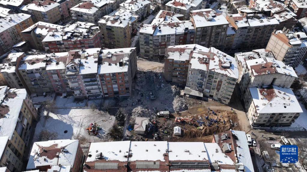 2月13日,在土耳其馬拉蒂亞,中國藍天救援隊隊員與當地救援人員在一處廢墟合作開(kāi)展地震救援工作。