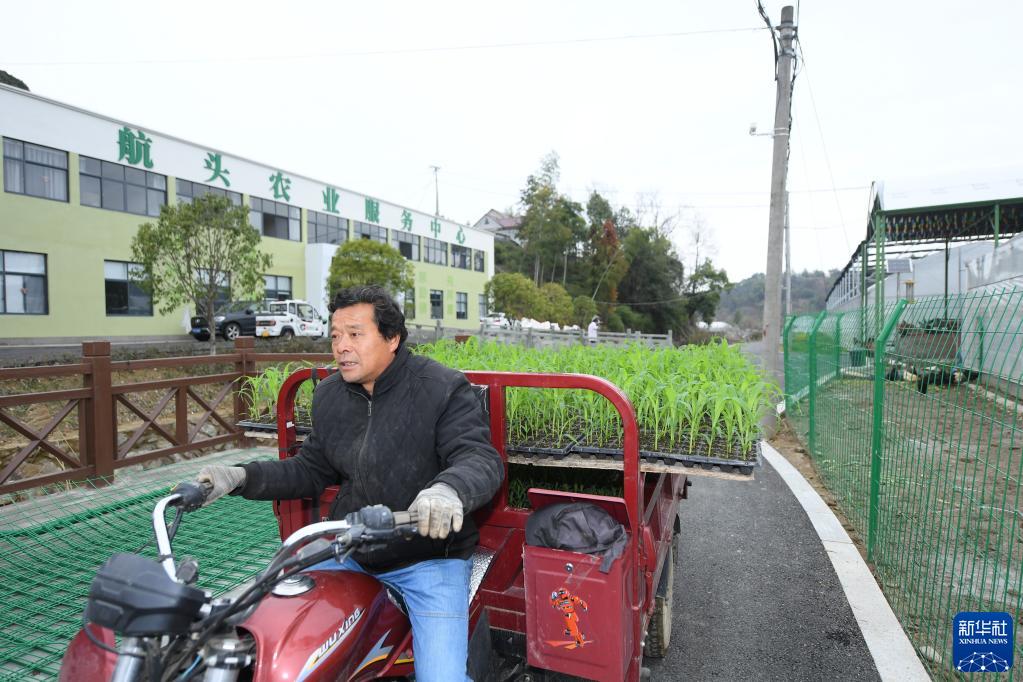 2月14日,在航頭鎮航川村,農戶(hù)將培育的玉米秧移到田里定植。
