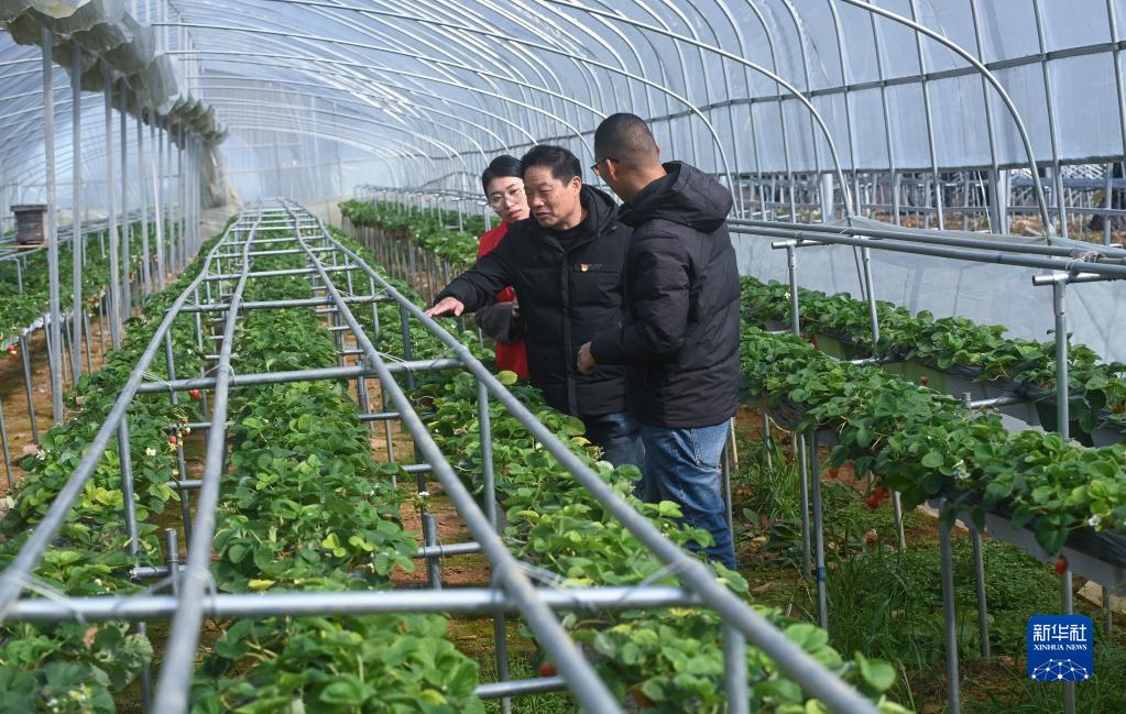 2月14日,在杭州市臨安區板橋鎮草莓種植基地內,“田間課堂”小分隊的農技專(zhuān)家馬紹鋼(中)在了解立體栽培的有機草莓的生長(cháng)及銷(xiāo)售情況,并對種植戶(hù)提出的問(wèn)題進(jìn)行解答。