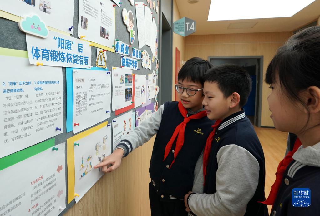 2月13日,在上海市長(cháng)寧區天山第一小學(xué),返校學(xué)生在走廊閱讀新學(xué)期體育鍛煉指南。