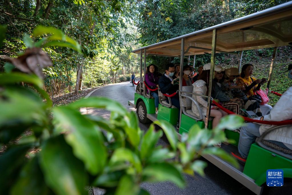 2月12日,游客在位于西雙版納州勐臘縣勐侖鎮的中國科學(xué)院西雙版納熱帶植物園內乘坐擺渡車(chē)游覽。