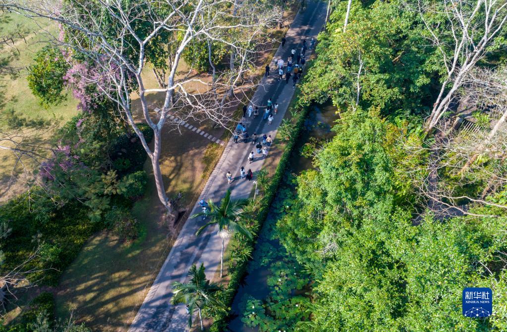 2月12日,游客在位于西雙版納州勐臘縣勐侖鎮的中國科學(xué)院西雙版納熱帶植物園內游覽(無(wú)人機照片)。