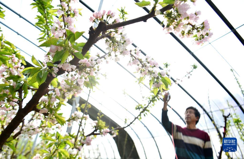 2月14日,石家莊市贊皇縣黃家溝櫻桃種植基地,果農進(jìn)行人工授粉。