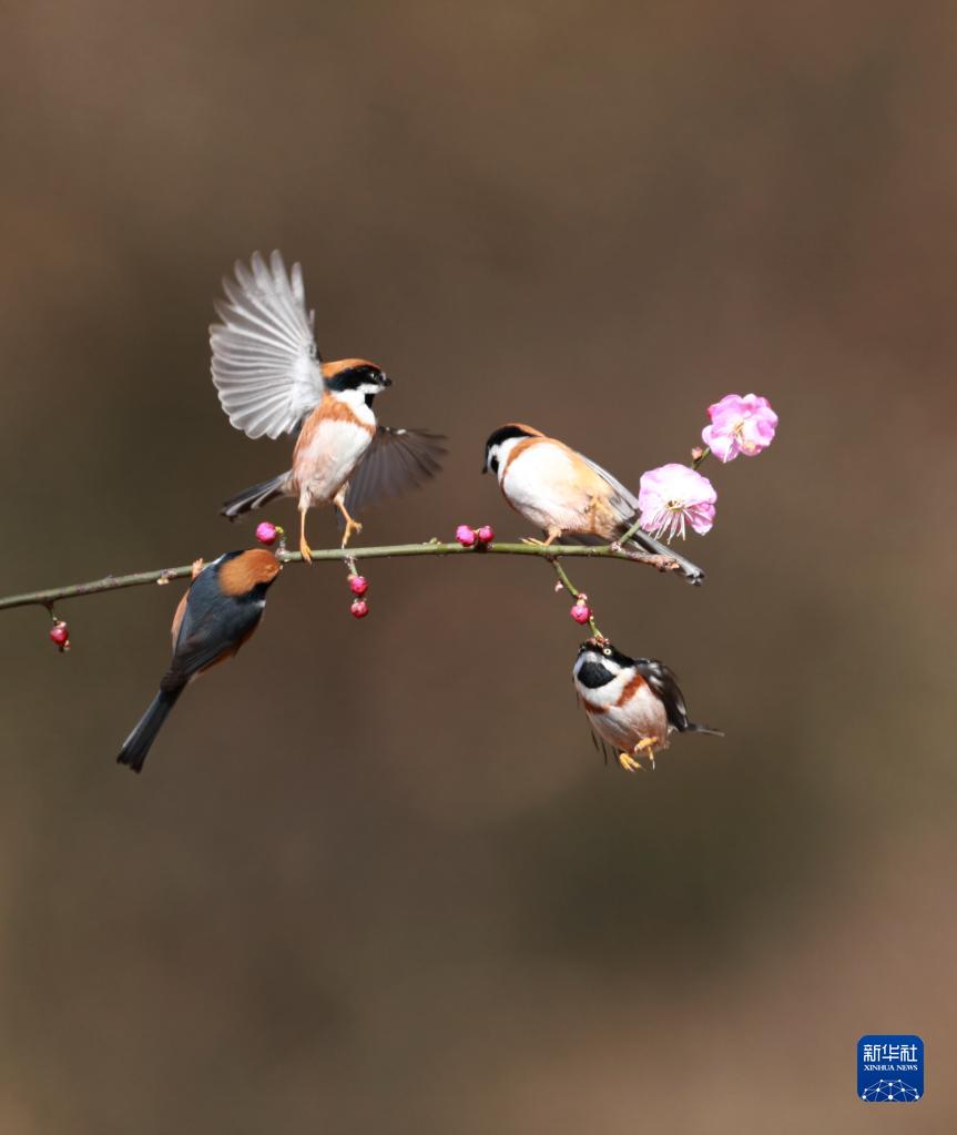 近日,江蘇鎮江西山水庫附近山花開(kāi)放,吸引紅頭長(cháng)尾山雀前來(lái)覓食小憩。