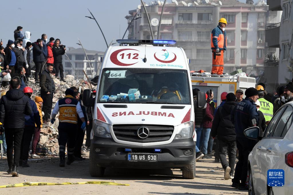 2月13日,在土耳其哈塔伊省安塔基亞市,救護車(chē)停在地震廢墟旁。