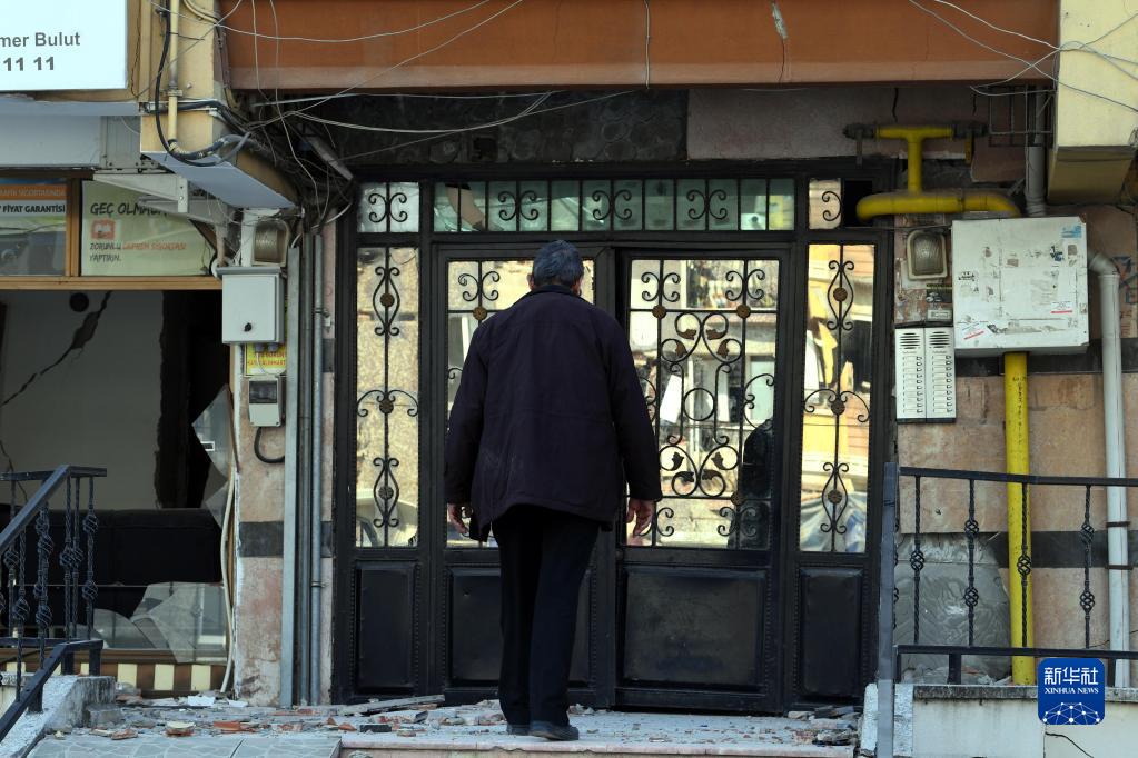 2月13日,在土耳其哈塔伊省安塔基亞市,一名男子站在因地震受損的建筑物前。