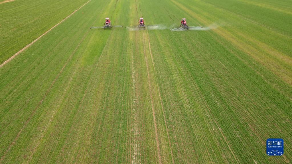 2月14日,在安徽省蚌埠市五河縣頭鋪鎮,農民駕駛農機給小麥噴灑農藥(無(wú)人機照片)。