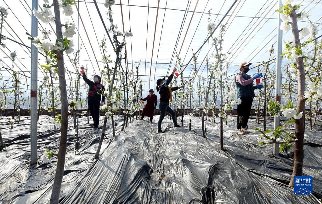 2月14日,在山東省淄博市沂源縣燕崖鎮燕崖村一大棚櫻桃種植園區,“產(chǎn)業(yè)工人”為櫻桃花授粉。